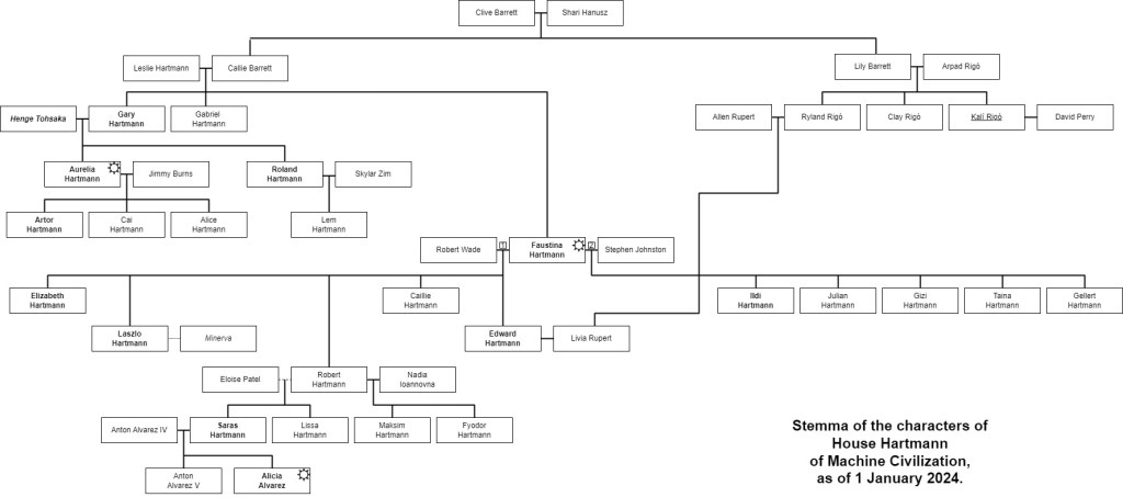 I had someone ask, “Who are all these people?” So, much like Reading Order, I thought I’d pin a post showing a simplified family tree of the Hartmann and Rigó branches, with a side mention of some of the Thinking Machines.